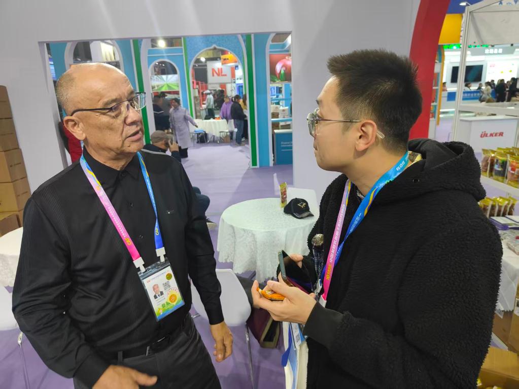 2025年10月24日,塔吉克斯坦杏和公司負責人普洛特·阿舒羅夫(左)介紹自己參加第32屆中國楊凌農(nóng)業(yè)高新科技成果博覽會的相關情況。新華社記者 姚友明 攝