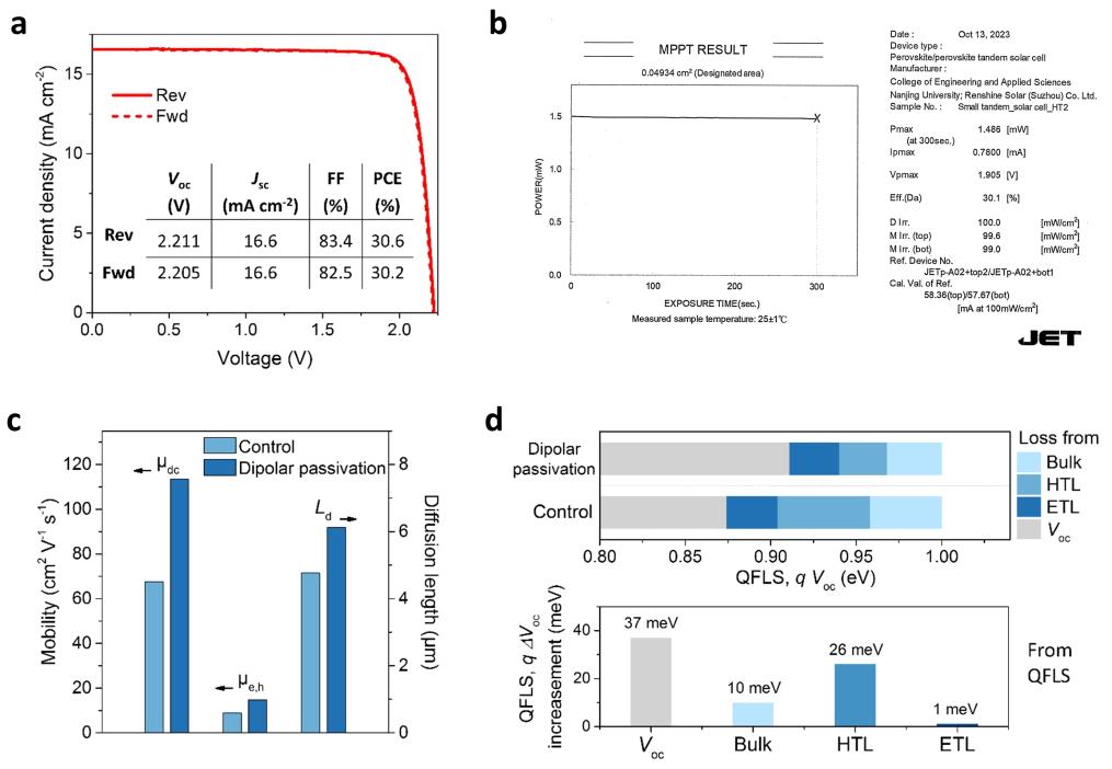 太赫茲輻射探測診斷結(jié)果清晰揭示了偶極鈍化策略在促進(jìn)電荷傳輸、抑制損耗等方面的微觀機(jī)制。實(shí)驗數(shù)據(jù)顯示,經(jīng)鈍化處理的鈣鈦礦薄膜,總載流子遷移率提升68%以上,載流子擴(kuò)散長度延長近30%。