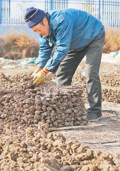 甘肅定西市漳縣,藥農(nóng)在晾曬藥材。