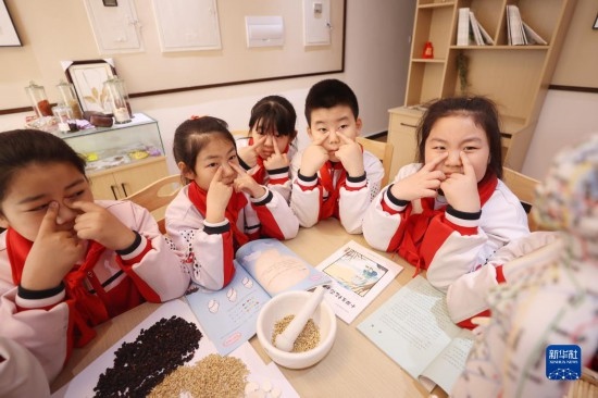 3月24日,河北省廊坊市第五小學學生在該校國醫(yī)館內跟隨老師識別中藥。