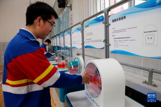 3月29日,中學(xué)生在校園流動(dòng)科普巡展中體驗(yàn)趣味科學(xué)裝置。