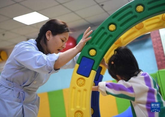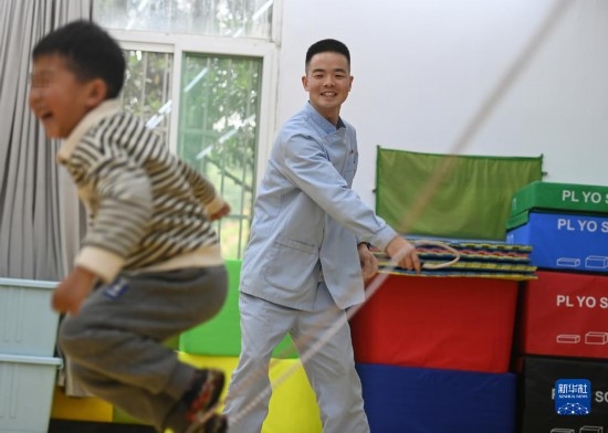3月30日,在西安市金色陽光康復中心,特教老師(左)指導孩子進行康復訓練。