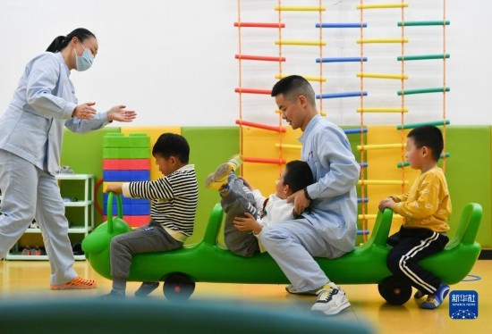 3月30日,在西安市金色陽光康復中心,孩子們在特教老師的保護下進行康復訓練。