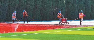 11月23日,工人在長(zhǎng)溝中學(xué)操場(chǎng)進(jìn)行塑膠跑道彈性層施工。 以上圖片均為宋濤攝 |