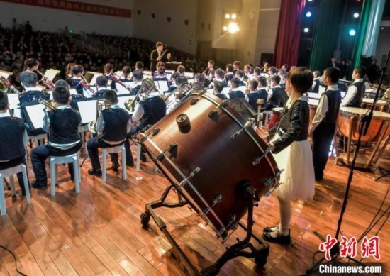 烏魯木齊市第27小學(xué)交響管樂(lè)團(tuán)登臺(tái)獻(xiàn)藝。中新網(wǎng)記者 劉新 攝