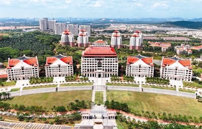 碧空悠悠,湖水如鏡。西洋風(fēng)格搭配閩南傳統(tǒng)燕尾脊屋頂?shù)慕ㄖ溆谑[翠之中,陳嘉庚雕塑在晨光中投下長(zhǎng)長(zhǎng)的影子,學(xué)生們邁著輕快的步伐趕往教室。廈門(mén)大學(xué)馬來(lái)西亞分校(簡(jiǎn)稱“廈大馬?!保┑那宄砍錆M生機(jī)。如今,這所高等學(xué)府成為中馬高等教育合作的旗艦項(xiàng)目。