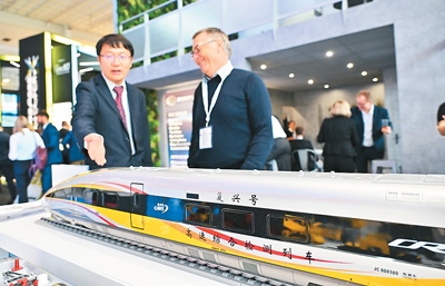 | 日前,在德國柏林軌道交通展上,中國鐵道科學研究院集團有限公司工作人員(左)向參觀者介紹復興號高速綜合檢測列車模型。新華社發(fā) |