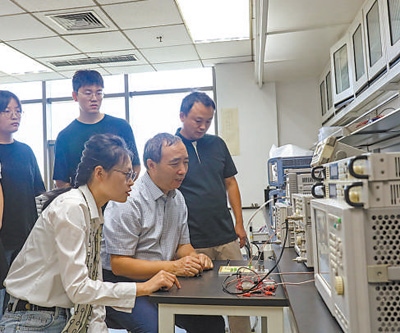 北京郵電大學(xué)多頻微波通信技術(shù)團(tuán)隊(duì)的劉元安教授(右二)指導(dǎo)學(xué)生開展科研工作。唐玉嬋攝(人民視覺)