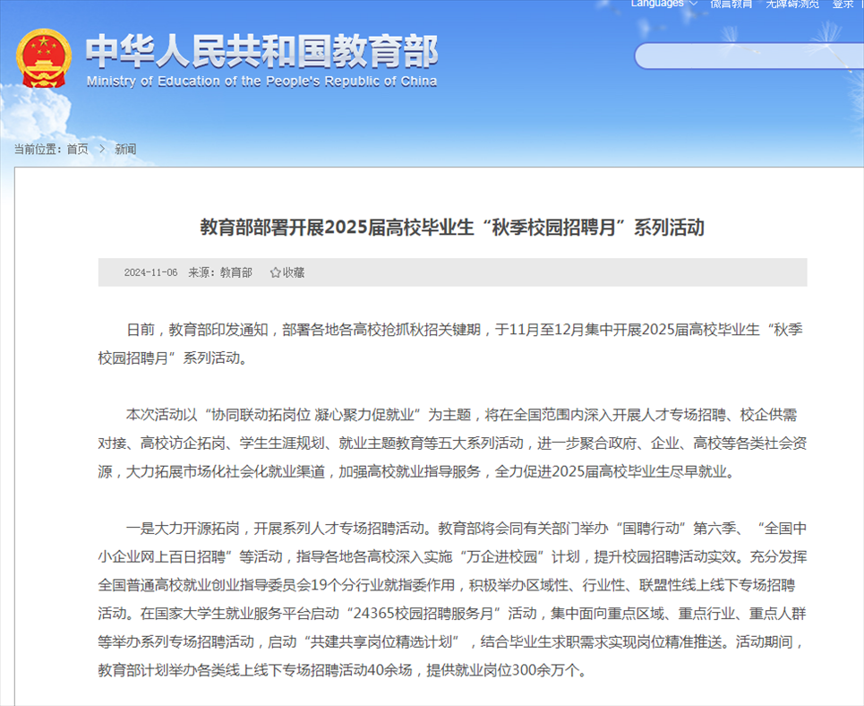 記者11月6日從教育部獲悉,教育部近日印發(fā)通知,部署各地各高校搶抓秋招關鍵期,于11月至12月集中開展2025屆高校畢業(yè)生“秋季校園招聘月”系列活動。