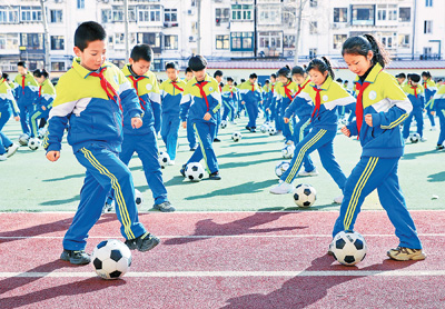 新學(xué)期伊始,河北省秦皇島市海港區(qū)耀華小學(xué)以足球素質(zhì)操等活動結(jié)合十余種自主游戲項(xiàng)目,讓學(xué)生在趣味活動中提升體能。圖為2月18日,學(xué)生在展示足球素質(zhì)操。