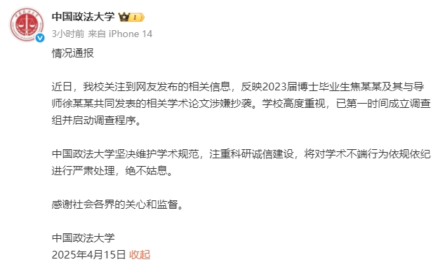 人民網(wǎng)北京4月15日電 (記者孫競)今天上午,中國政法大學(xué)發(fā)布情況通報(bào)稱,該校關(guān)注到網(wǎng)友發(fā)布的相關(guān)信息,反映2023屆博士畢業(yè)生焦某某及其與導(dǎo)師徐某某共同發(fā)表的相關(guān)學(xué)術(shù)論文涉嫌抄襲。學(xué)校高度重視,已第一時(shí)間成立調(diào)查組并啟動調(diào)查程序。