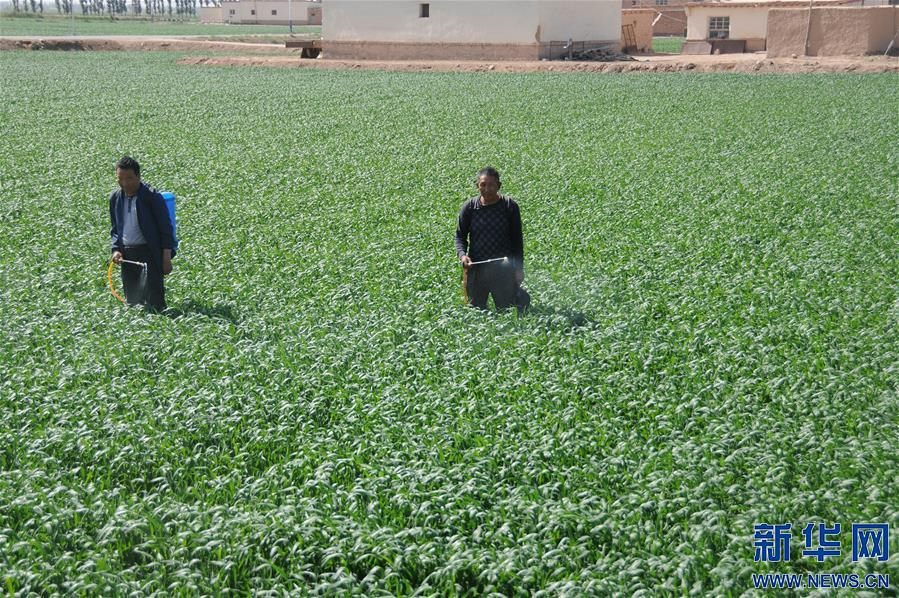 5月28日,內(nèi)蒙古巴彥淖爾市臨河區(qū)干召?gòu)R鎮(zhèn)棋盤村村民在麥田中噴藥防治病蟲(chóng)害。新華社記者李云平攝