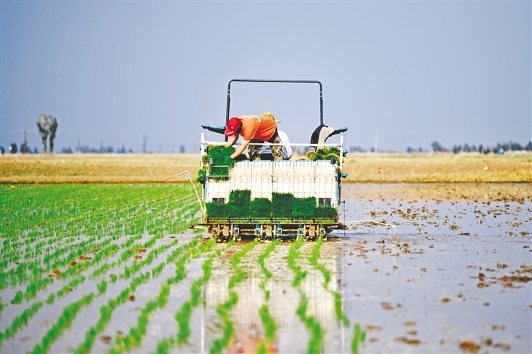 5月22日,鄂爾多斯市達拉特旗昭君鎮(zhèn)沙圪堵村水稻種植戶正在插秧。據(jù)了解,達拉特旗充分利用鹽堿地,種植耐鹽堿水稻,帶動村民增收致富,今年預(yù)計種植3.8萬畝。(本報記者 孟和朝魯 攝)