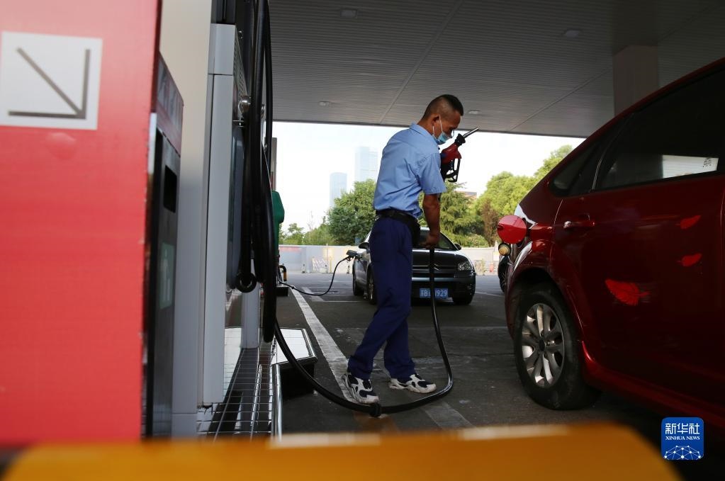 8月9日,江蘇無(wú)錫一加油站工作人員給汽車(chē)加油。新華社發(fā)(還月亮 攝)