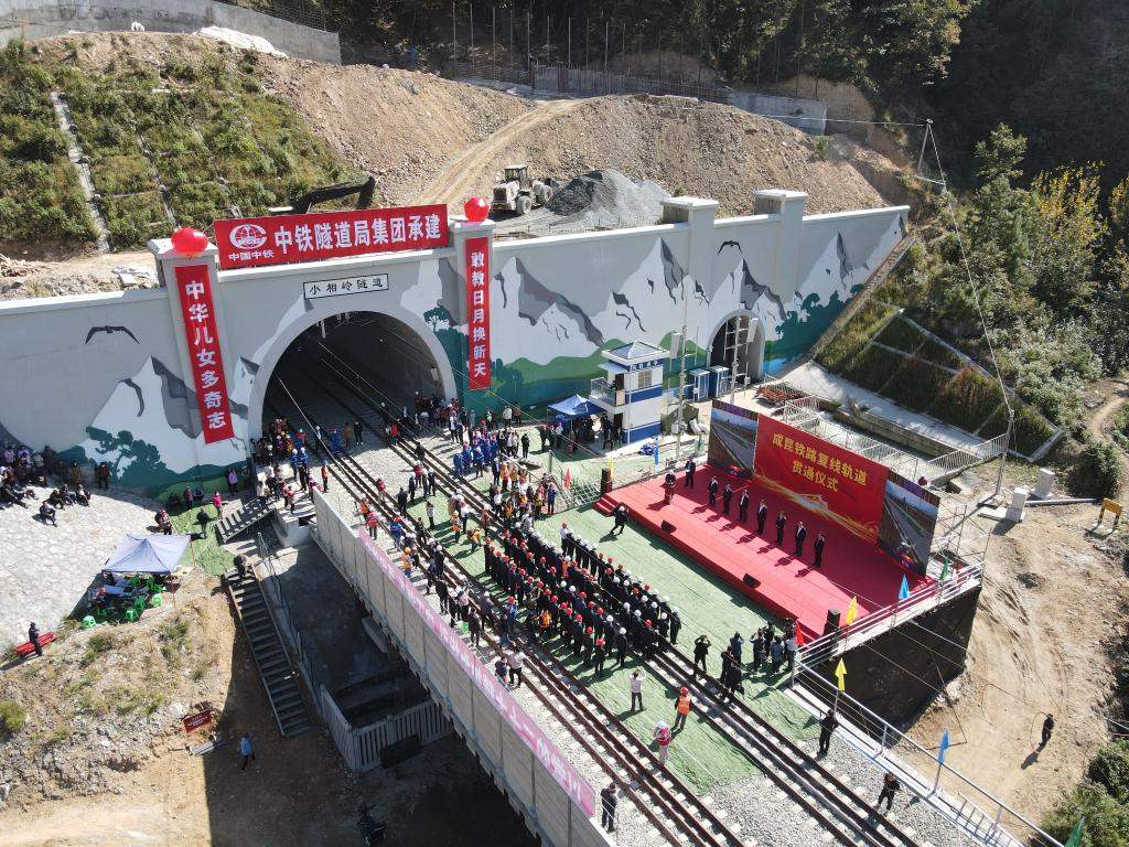 小相嶺隧道口的成昆鐵路復(fù)線軌道貫通儀式現(xiàn)場(chǎng)。(中國鐵路成都局集團(tuán)公司供圖)