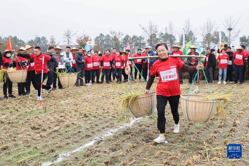 11月15日,在德清縣舉辦的美好家園運動會暨新安鎮(zhèn)稻田爭霸賽上,村民參加挑稻谷接力賽。新華社發(fā)(姚海翔 攝)