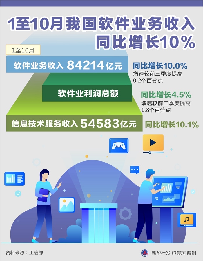 記者24日從工信部獲悉,1至10月,我國軟件和信息技術(shù)服務(wù)業(yè)運(yùn)行態(tài)勢平穩(wěn)向好,軟件業(yè)務(wù)收入84214億元,同比增長10.0%,增速較前三季度提高0.2個(gè)百分點(diǎn)。