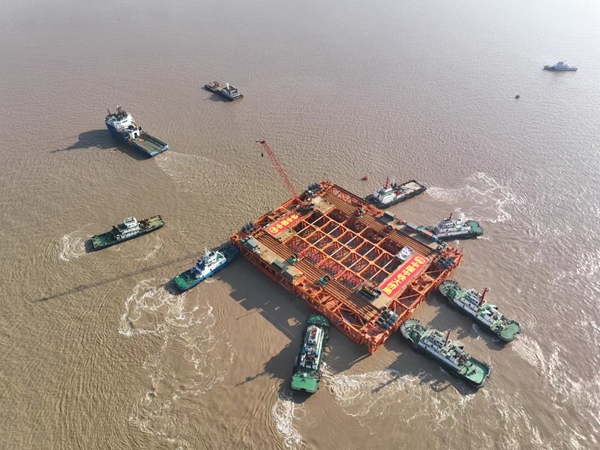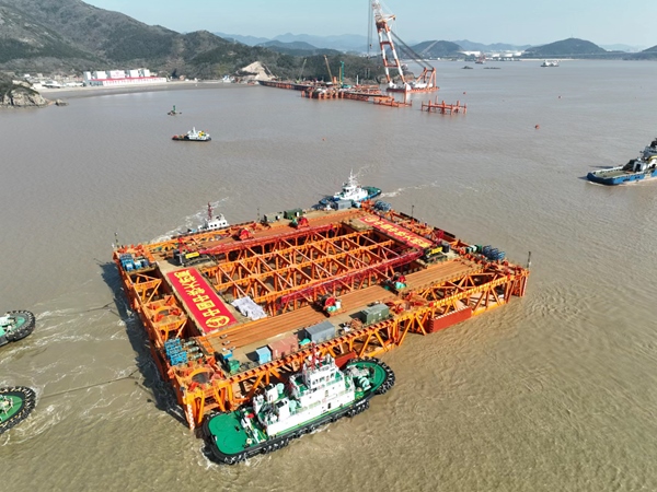 “自浮式鉆孔平臺定位后,我們將為平臺裝上8根將近百米的‘大長腿’,讓其能‘站’起來并屹立于海面之上。待平臺建好后,將把水上施工轉(zhuǎn)為陸地施工,既能縮短海上作業(yè)時(shí)間,也能確保施工安全質(zhì)量,為后續(xù)的6.3米世界最大直徑鉆孔樁施工提供有力保障?!敝需F大橋局甬舟鐵路西堠門公鐵兩用大橋總工程師王東輝說。