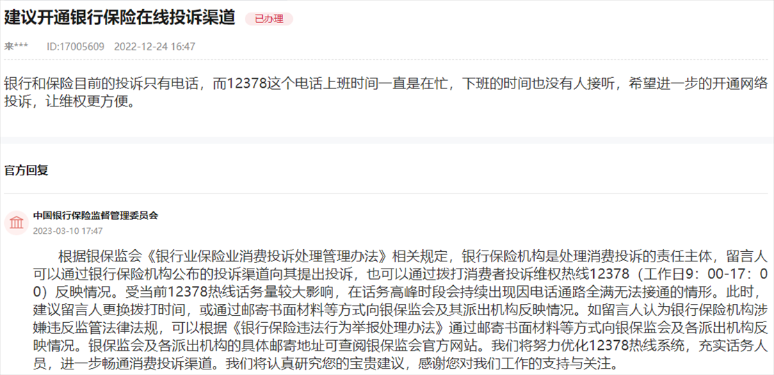 針對(duì)網(wǎng)友提出的“建議開(kāi)通銀行保險(xiǎn)在線(xiàn)投訴渠道”,銀保監(jiān)會(huì)在回復(fù)中表示,將努力優(yōu)化消費(fèi)者投訴維權(quán)熱線(xiàn)12378系統(tǒng),充實(shí)話(huà)務(wù)人員,進(jìn)一步暢通消費(fèi)投訴渠道。
