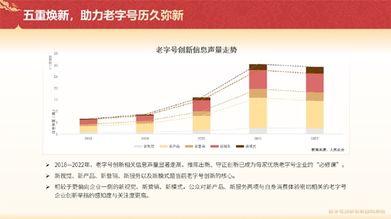 《報(bào)告》基于近五年傳播與實(shí)體數(shù)據(jù)信息,綜合運(yùn)用全量及抽樣分析方法,洞察老字號(hào)五大創(chuàng)新發(fā)展趨勢(shì),分析老字號(hào)在創(chuàng)新過(guò)程中暴露出的不足,并提出針對(duì)性建議舉措。