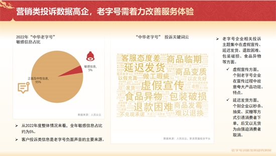 《報(bào)告》同時(shí)指出,在消費(fèi)者側(cè),客戶投訴類(lèi)信息是老字號(hào)負(fù)面聲音的主要來(lái)源,老字號(hào)企業(yè)相關(guān)投訴主題集中在虛假宣傳、延遲發(fā)貨、退款困難、包裝破損、食品異物等方面。這些問(wèn)題不僅影響了消費(fèi)者體驗(yàn),也不利于企業(yè)自身保持優(yōu)質(zhì)的聲譽(yù)形象。