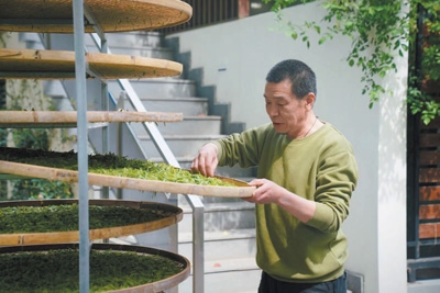 “也是巧了!原本兩周前房間就預(yù)訂光了,有個來自上海的團(tuán)隊預(yù)約到茶山采茶,但今天客人臨時調(diào)整房間,多出來一間房,你們感興趣也可以去采茶?!碑吔终f,“茶園就在后山上,走著就到了。明天上午采茶,下午晾曬,晚上炒制,當(dāng)晚就能喝到自己親手摘的綠茶了?!倍庞轩i和老伴兒聽了很感興趣,當(dāng)即決定多住一晚。