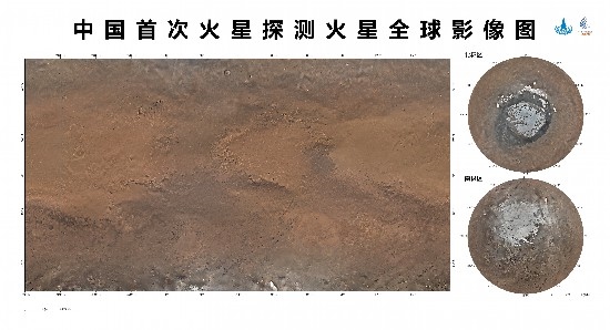 人民網(wǎng)北京4月24日電 (記者趙竹青、王震)記者從國(guó)家航天局獲悉,4月24日,在2023年“中國(guó)航天日”主場(chǎng)活動(dòng)啟動(dòng)儀式上,國(guó)家航天局和中國(guó)科學(xué)院聯(lián)合發(fā)布了中國(guó)首次火星探測(cè)火星全球影像圖。本次發(fā)布的影像圖為彩色,包括按照制圖標(biāo)準(zhǔn)分別制作的火星東西半球正射投影圖、魯賓遜投影圖和墨卡托投影加方位投影圖,空間分辨率為76米,將為開(kāi)展火星探測(cè)工程和火星科學(xué)研究提供質(zhì)量更好的基礎(chǔ)底圖。天問(wèn)一號(hào)任務(wù)獲取的包括影像圖在內(nèi)的一批科學(xué)探測(cè)數(shù)據(jù),將為人類深入認(rèn)知火星作出中國(guó)貢獻(xiàn)。