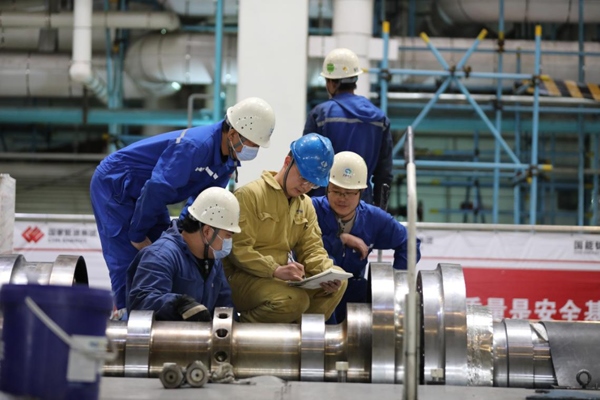 樊瑞(中)和同事正在記錄轉(zhuǎn)子檢修數(shù)據(jù)。受訪者供圖