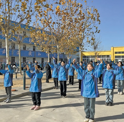 上午10點(diǎn),下課鈴一響,麥仁學(xué)校的學(xué)生們迅速在操場上整齊排列,做起了課間操。