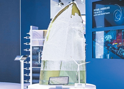 西門子能源展出全球首款可回收風機葉片。葉片使用周期結(jié)束后,其部件材料可通過工業(yè)化方式,進行樹脂和纖維材料的安全環(huán)保分離,回收的纖維材料仍保持良好性能。本報記者 廖睿靈攝