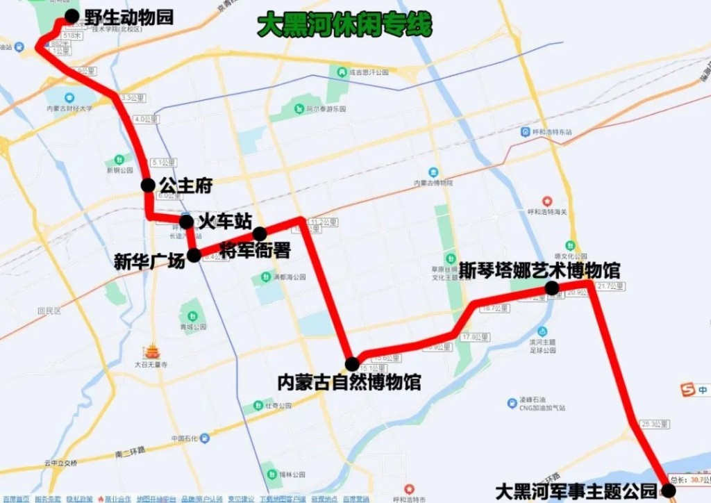大黑河休閑專線(大青山野生動(dòng)物園——大黑河軍事主題公園),途經(jīng):Y317、通道北路、車站西街、錫林北路、新華大街、興安南路、金橋路、大黑河北岸路。沿途設(shè)站:野生動(dòng)物園、公主府、火車站、新華廣場、將軍衙署、內(nèi)蒙古自然博物館、斯琴塔娜藝術(shù)博物館、大黑河軍事主題公園,單程:30.7公里,配車:8—10臺(tái)。