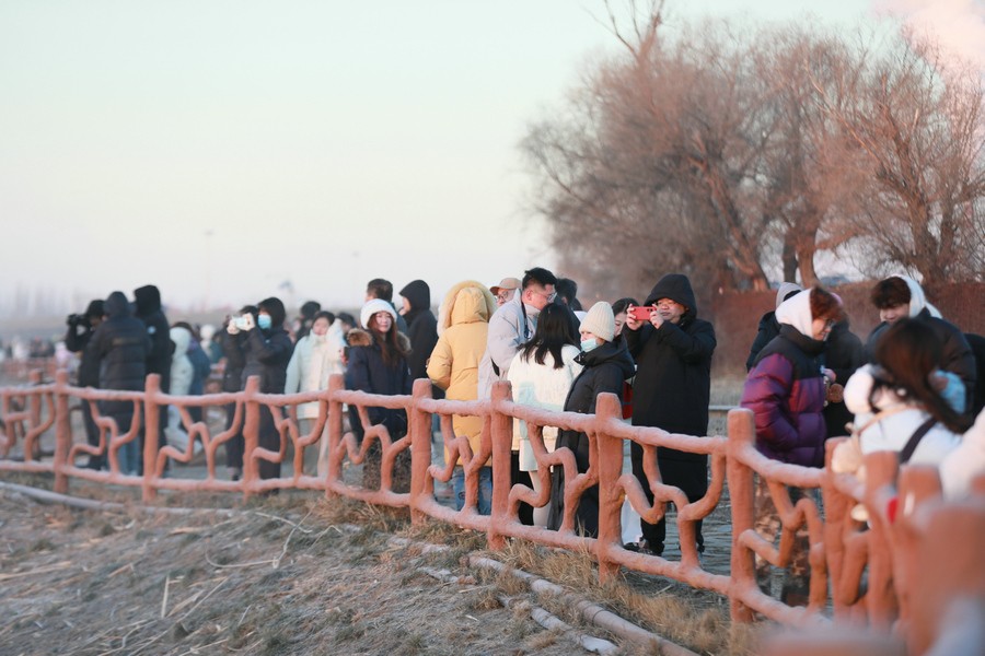 12月15日清晨,上千名游人在呼和浩特玉泉區(qū)班定營村南側(cè)的塞外“千島湖”畔賞景打卡。此處湖水為城市污水經(jīng)處理達標(biāo)后的再生水,隆冬時節(jié),再生水流入湖中,水汽蒸騰,岸邊草木霧凇皚皚,良好的生態(tài)吸引了數(shù)萬只赤麻鴨在此翔集棲息,構(gòu)成一幅生動和諧的美麗畫面。每日清晨,都有上千名游客來此觀日出賞美景。