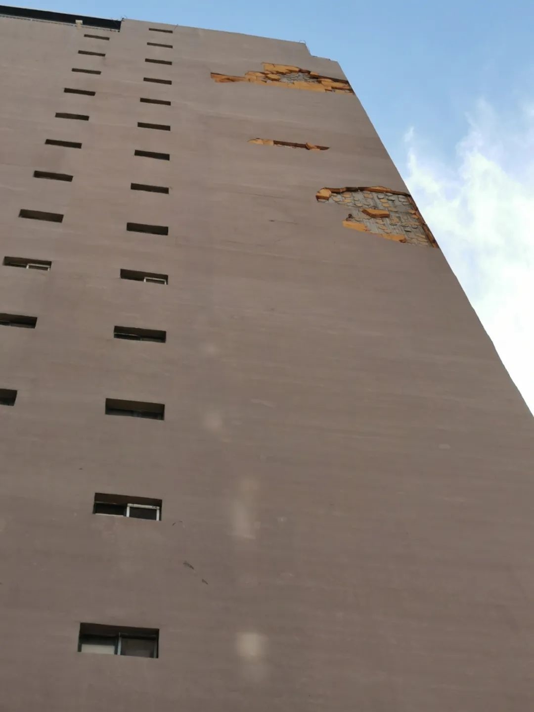 7月1日10時許,記者來到聞都雅苑4號樓下,抬頭望去,該棟樓西側墻壁有三處地方出現(xiàn)破損,大片的墻皮和里面的保溫層均已脫落。記者注意到,聞都雅苑共有4棟高層,該小區(qū)只有東西和南北兩條主干道以及西側一條小走廊,而4號樓正好位于南北主干道一側。據(jù)小區(qū)居民郝先生介紹,不斷掉落的保溫層已經威脅到了居民的人身安全。今年5月6日,呼和浩特市出現(xiàn)大風天氣,在風力的作用下,4號樓東西兩側的外墻保溫層出現(xiàn)大面積脫落,一位恰巧路過4號樓西側的女性業(yè)主不幸被掉落的材料砸中,導致腿部受傷,此事也給小區(qū)居民帶來了恐慌。