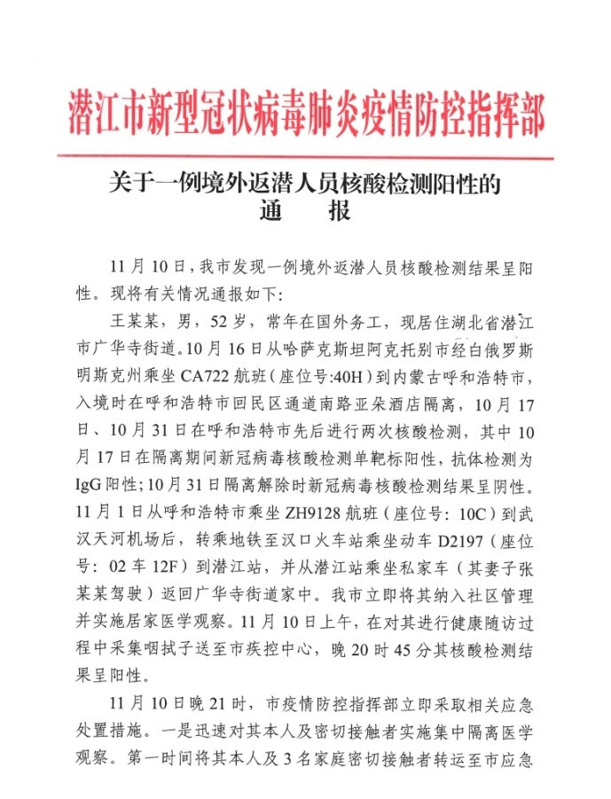 王某某,男,52歲,常年在國外務工,現(xiàn)居住湖北省潛江市廣華寺辦事處。2020年10月16日從哈薩克斯坦阿克托別市經(jīng)白俄羅斯明斯克州乘坐CA722航班(座位號:40H)到內(nèi)蒙古呼和浩特市,入境時在呼和浩特市回民區(qū)通道南路亞朵酒店隔離,10月17日、10月31日在呼和浩特先后進行兩次核酸檢測,其中10月17日在隔離期間新冠病毒核酸檢測單靶標陽性,抗體檢測為LgG陽性;10月31日隔離解除時新冠病毒核酸檢測陰性。11月1日從呼和浩特市乘坐ZH9128航班(座位號:10C)到武漢天河機場后,轉(zhuǎn)乘地鐵至漢口火車站乘坐動車D2197(座位號:02車12F)到潛江,從潛江乘坐私家車(其妻子張某某駕駛)返回廣華家中,并落實社區(qū)管控措施。11月10日,其咽拭子送至潛江市疾控中心核酸檢測結(jié)果呈陽性。