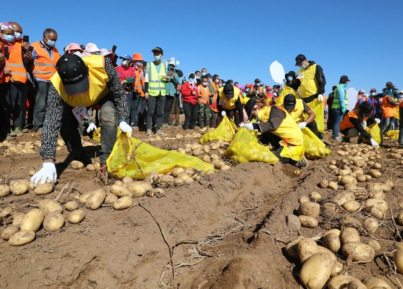 豐收節(jié)現(xiàn)場,還舉行了別開生面的土豆趣味運(yùn)動會,6支代表隊(duì)參加了比賽,裁判員以速度計(jì)時(shí)、數(shù)量稱重等方式來決定最后的勝負(fù),比賽過程熱火朝天,參賽者的臉上洋溢著喜悅的笑容。