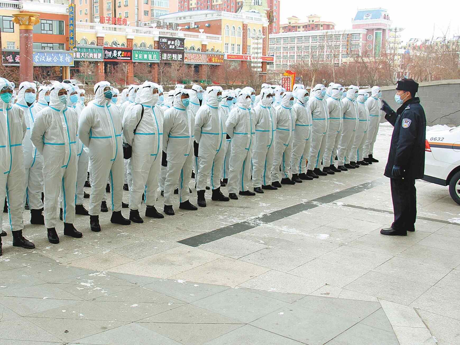 11 月28 日,扎蘭屯市公安局緊急抽調100 名精干警力組成疫情防控突擊隊,馳援滿洲里市,守護人民安全。
