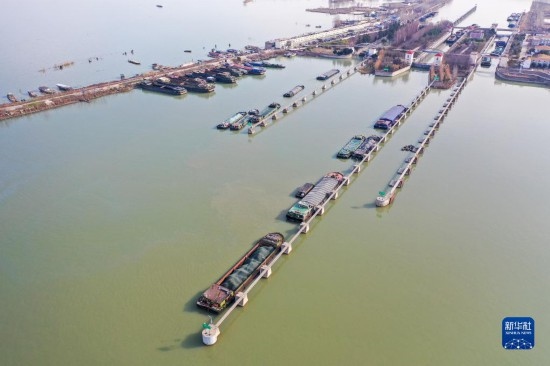 2月14日,貨船有序通過位于江蘇宿遷的京杭大運(yùn)河皂河船閘(無人機(jī)照片)。