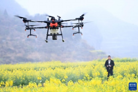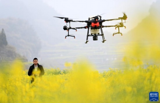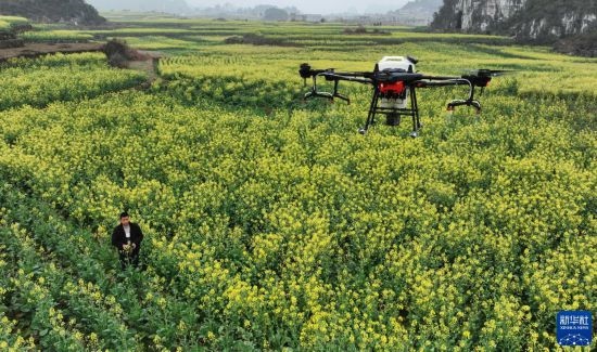 2月17日,在貴州省六盤水市六枝特區(qū)木崗鎮(zhèn)油菜基地,農(nóng)技人員利用植保無人機進行春管。