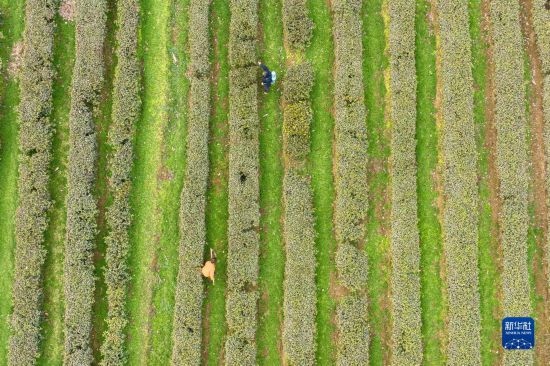 2月17日,茶農(nóng)在湖北省丹江口市土關(guān)埡村武當(dāng)茶谷勞作(無(wú)人機(jī)照片)。