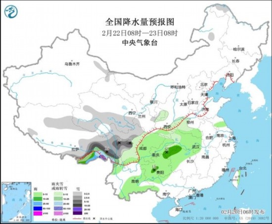 2月22日08時(shí)至23日08時(shí),西藏東部、云南西北部、青海南部、川西高原、甘肅東部、陜西東南部、河南西部等地部分地區(qū)有小到中雪或雨夾雪,其中,西藏東部、川西高原、云南西北部等地局地有大到暴雪(10~15毫米)。西南地區(qū)大部、江漢大部、湖南西部和北部等地部分地區(qū)有小到中雨,其中,西藏東南部局地有大到暴雨。臺灣海峽、巴士海峽、南海東部等地部分地區(qū)有6~7級風(fēng),陣風(fēng)8級。