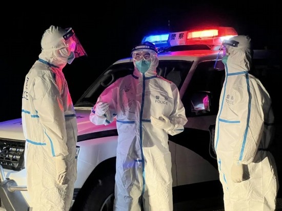 圖為疫情期間,黃健現(xiàn)場(chǎng)帶領(lǐng)民警開(kāi)展防疫查驗(yàn)工作