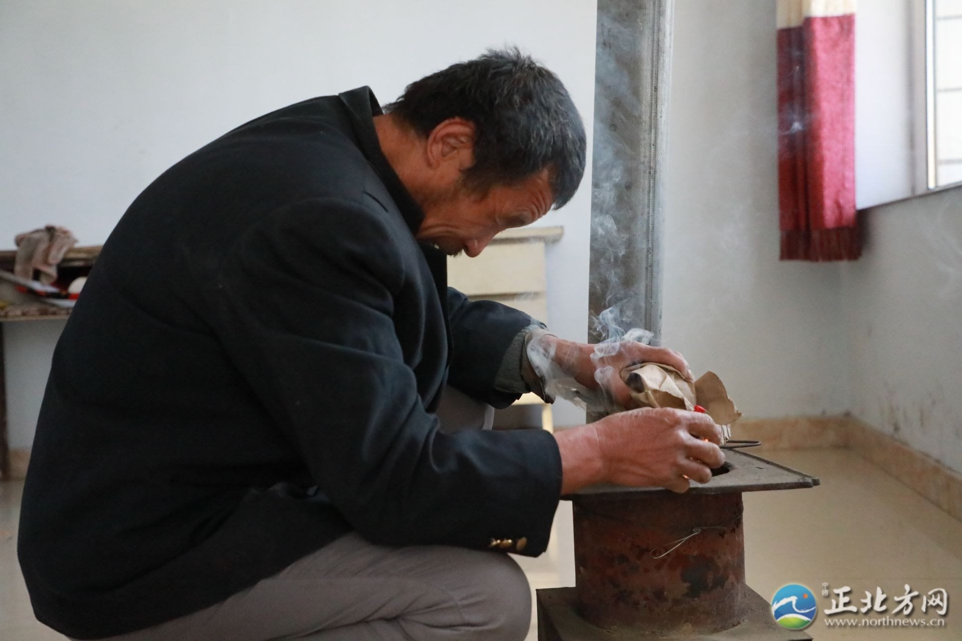 何蘭鎖63歲,黝黑的臉膛,兩個眼窩深陷,看不到眼珠。聽到記者來采訪,他熱情地把記者讓進屋,摸索著拿起水壺倒了兩杯熱茶,“你們稍坐一坐,家里有點冷?!焙翁m鎖笑起來眉眼彎彎,說著,又轉(zhuǎn)身拿著錘子,熟門熟路地進入涼房去打炭,開始生火。