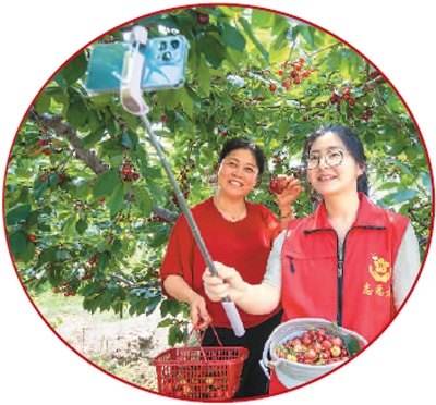 2022年6月8日,江蘇省海安市大公鎮(zhèn)姜橋村一櫻桃種植園內(nèi),青年黨員志愿者與農(nóng)場(chǎng)主一起直播推銷剛剛采摘的櫻桃。 翟慧勇攝(人民視覺)