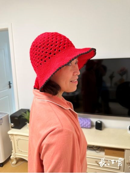 黃小珍戴著自己鉤出的毛線帽