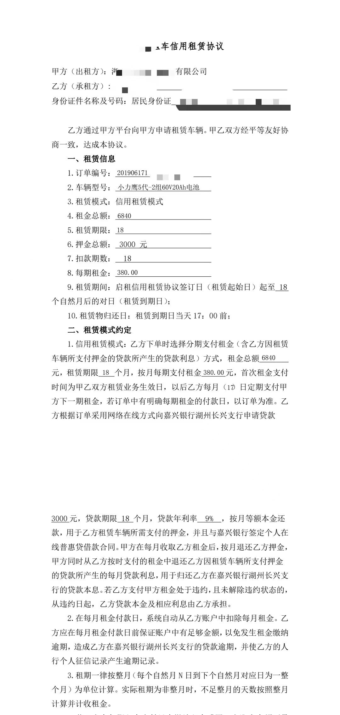 在蔡波發(fā)給記者的《租車信用租賃協(xié)議》里,只有出租方和承租方兩方,其中寫道:“乙方需要根據(jù)訂單采用網(wǎng)絡(luò)在線方式向嘉興銀行湖州長興支行申請貸款3000元,貸款期限18個月,貸款年利率9%。”蔡波表示,在結(jié)束用車之后,自己沒有繼續(xù)還款。