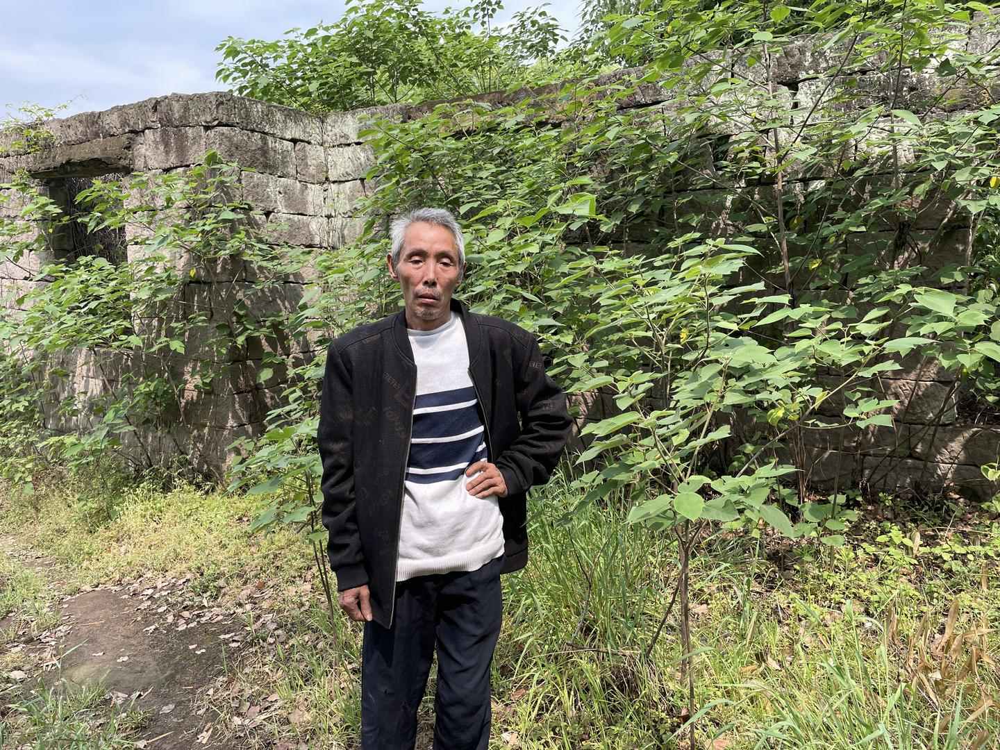 從“大巖洞”爬上一個陡坡,再走百多米小路,就是馮必全曾經(jīng)的家。由于房子長期無人居住,房頂全沒了,僅剩兩米左右高、光禿禿的石頭墻。屋里長起來的雜木,大的已經(jīng)有小碗那么粗了。