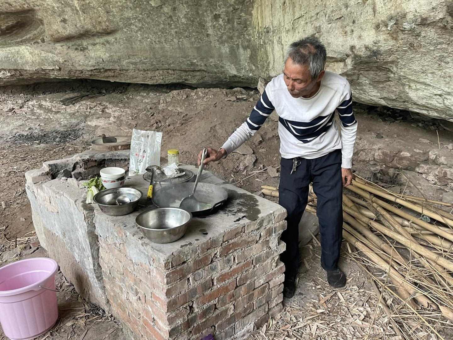 4月12日11時左右,紅星新聞記者在當(dāng)?shù)卮迕駧ьI(lǐng)下探訪了馮必全居住的“大巖洞”。當(dāng)時馮必全已在洞里煮好稀飯,正在煮厚皮菜。紅星新聞記者看到,馮必全炒菜時沒有油,直接把煮熟的厚皮菜倒進(jìn)鍋里加鹽翻炒。他說自己最近都這樣吃,因為沒錢買油。