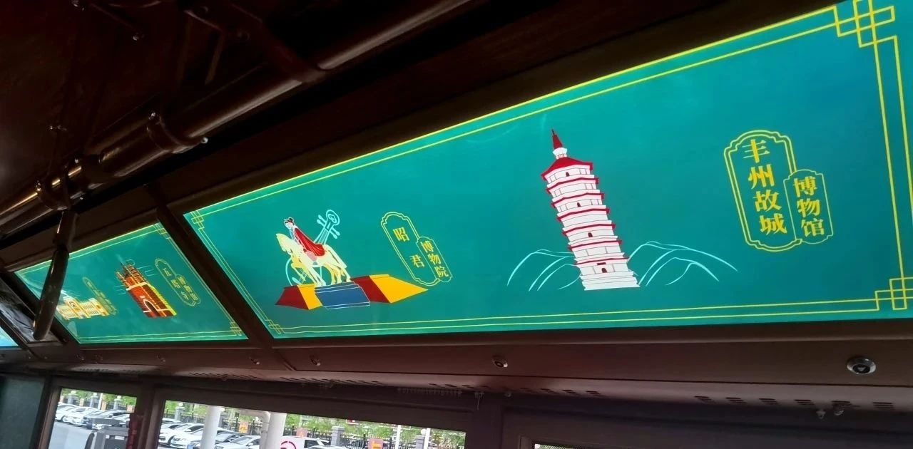 除了復(fù)古風的車身外型,主題車廂內(nèi)也充滿了如詩如畫的文旅元素,為乘客們顯示了五塔寺、昭君博物院、豐州故城博物館等本土旅游勝地,乘坐鐺鐺車,乘客在瀏覽美麗街景的同時,也可通過車內(nèi)看板了解到青城的名勝古跡。