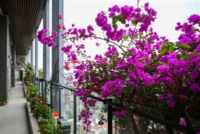 這棟“三角梅大樓”一共有32層(躍層),兩個單元,每層8戶,一共240戶人家。三角梅種植在每一層的公共空間長廊上,每家每戶前都有三角梅種植點。久而久之,每家每戶也在三角梅的基礎上,按照個人愛好興趣種植了更多的綠植、瓜果、蔬菜等,成為小區(qū)一景。