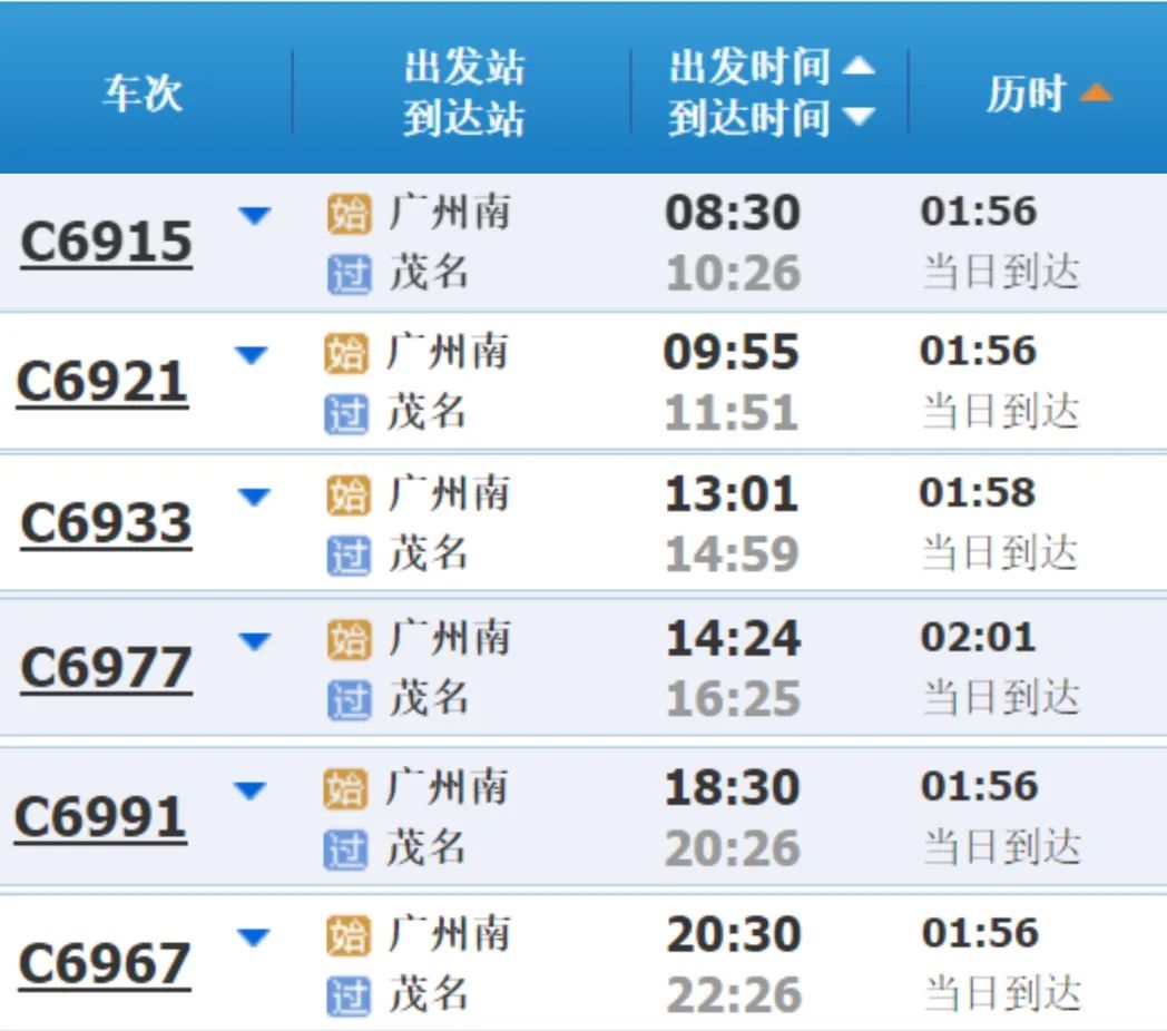茂名站位于江湛鐵路上,是一個(gè)運(yùn)營城際列車和普速鐵路的混合車站。廣州南至茂名的城際列車日常開行45對,周末增加至52對,將茂名到廣州的旅行時(shí)間縮短至2小時(shí)左右,十分方便。